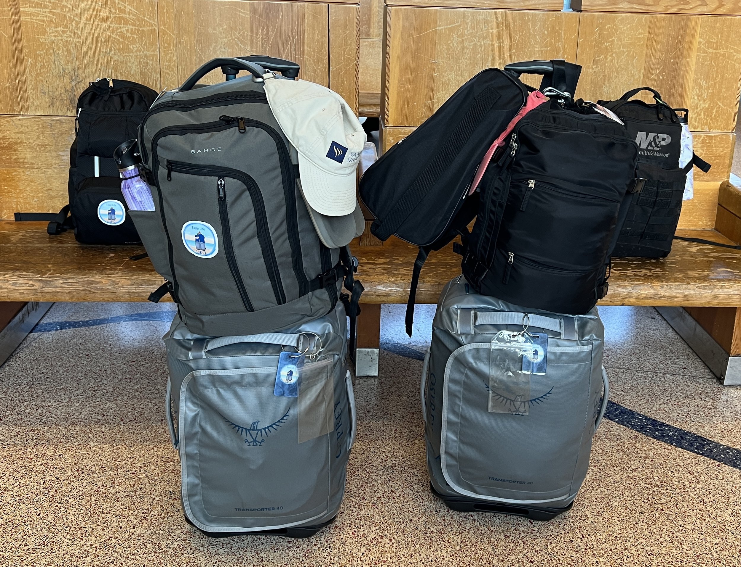 We started our global nomad life with the bags you see in this photo…that was literally every single thing we own in this world. Believe it or not, that was too much! We’ve scaled it back multiple times already and replaced some items. This week, we’ll scale it back even more, to the grey Osprey carry-on roller bags you see and a small backpack each that will fit under the seat on the plane. In a practical sense, that’s the most you want to take….both for flight costs and especially just the hassle of lugging around too much stuff.
